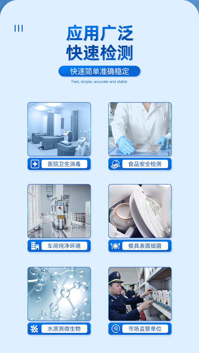 云唐ATP荧光检测仪广泛应用于:细菌微生物检测、医药卫生、食品安全、市场执法、表面洁净度检测、医疗防疫、水质水政、生产线卫生、工业水处理、环保检测、海关出入境检疫及其他执法部门等多种行业。