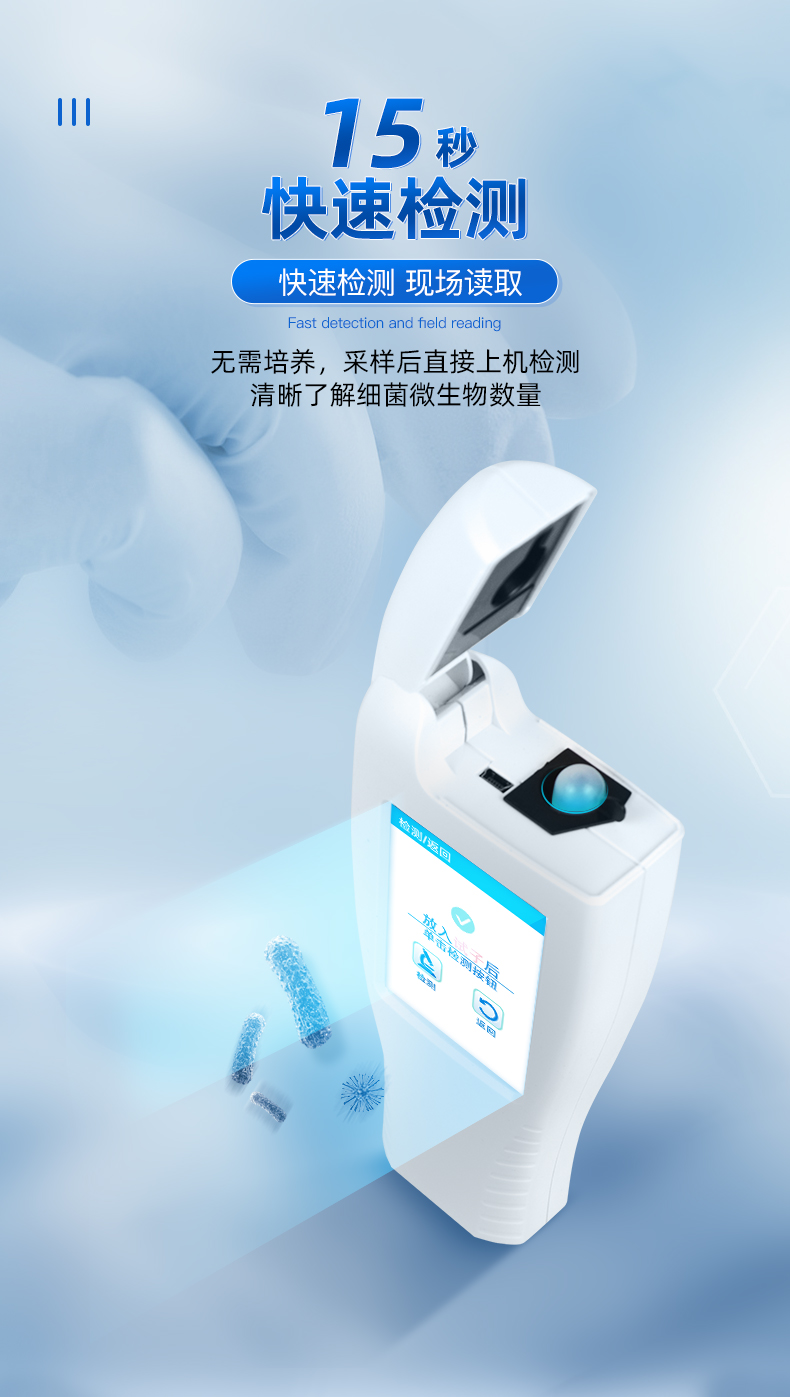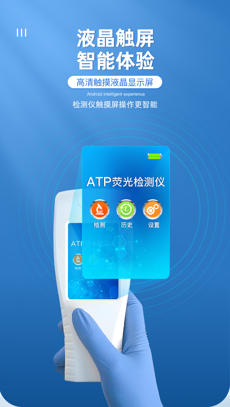 该设备为全新升级产品,大屏幕触摸显示屏,代替传统按键。操作采用生物化学反应方法检测ATP含量,ATP荧光检测仪基于萤火虫发光原理,利用“荧光素酶—荧光素体系”快速检测三磷酸腺苷(ATP)。ATP拭子含有可以裂解细胞膜的试剂,能将细胞内ATP释放出来,与试剂中含有的特异性酶发生反应,产生光,再用荧光照度计检测发光值,微生物的数量与发光值成正比,由于所有生物活细胞中含有恒量的ATP,所以ATP含量可以清晰地表明样品中微生物与其他生物残余的多少,用于判断卫生状况。
