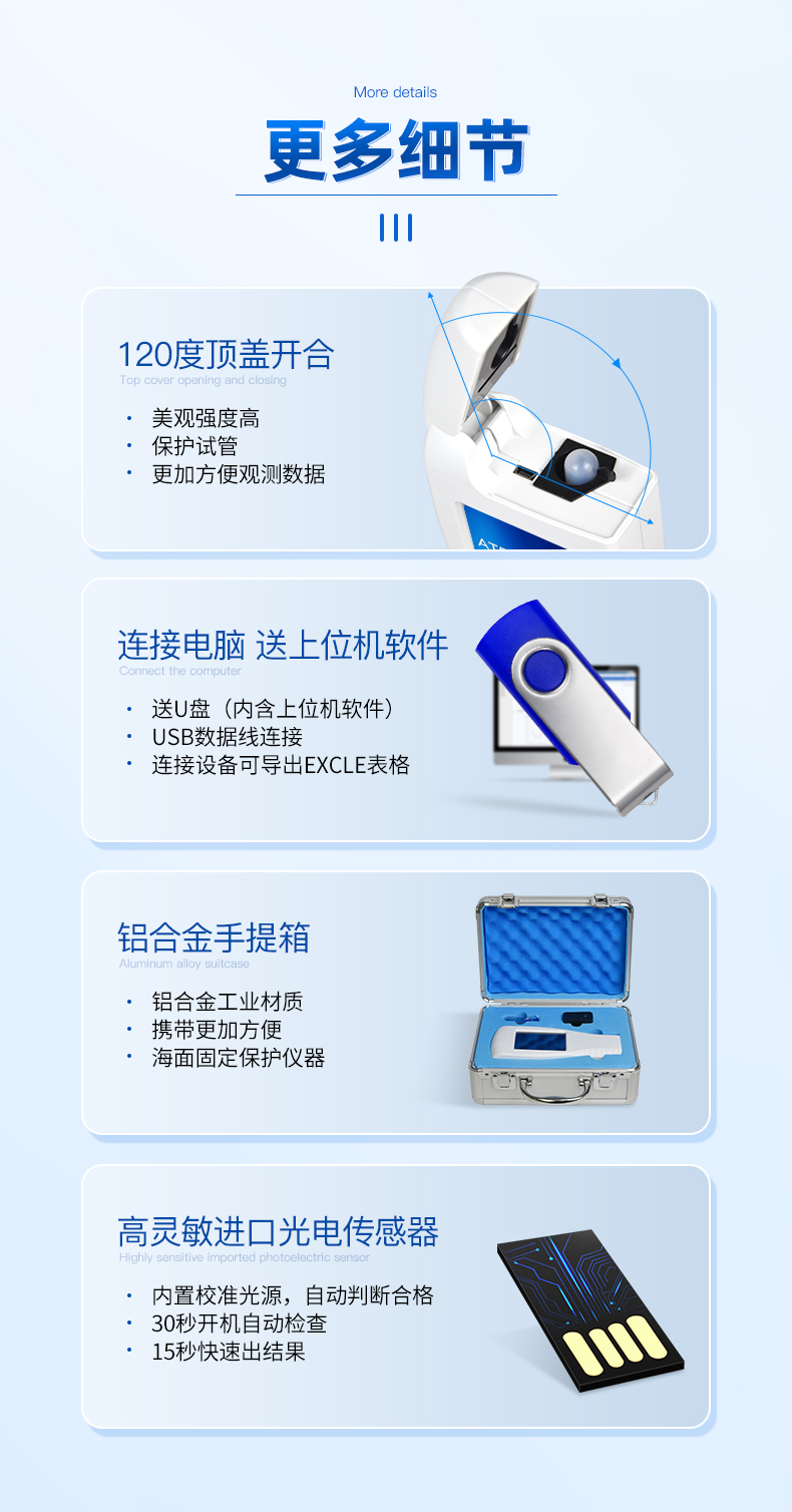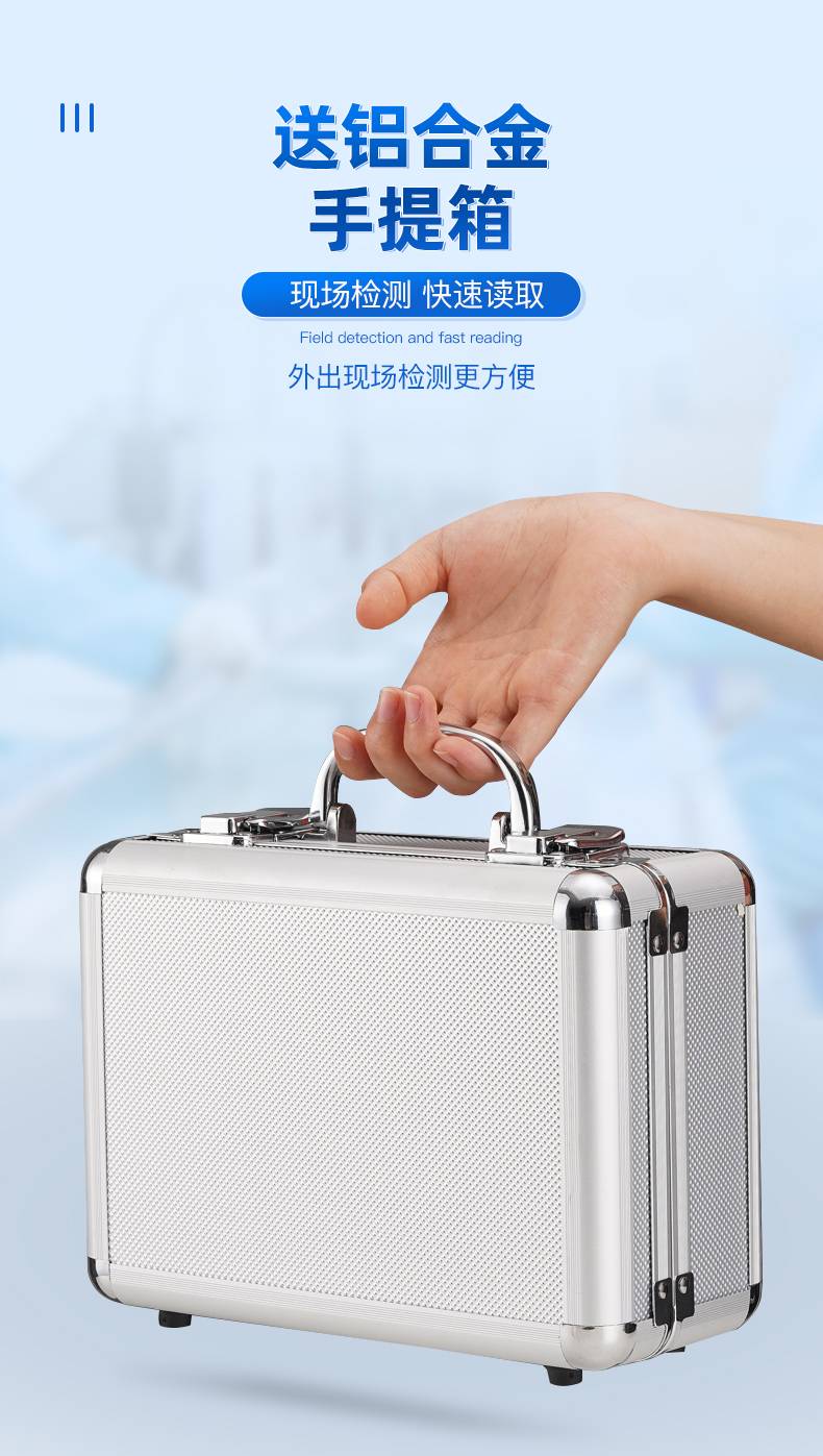 随机配置:ATP荧光检测仪(手持)主机、铝合金手提箱、驱动U盘、仪器包、挂绳、PC数据线、数据分析软件、中文操作手册