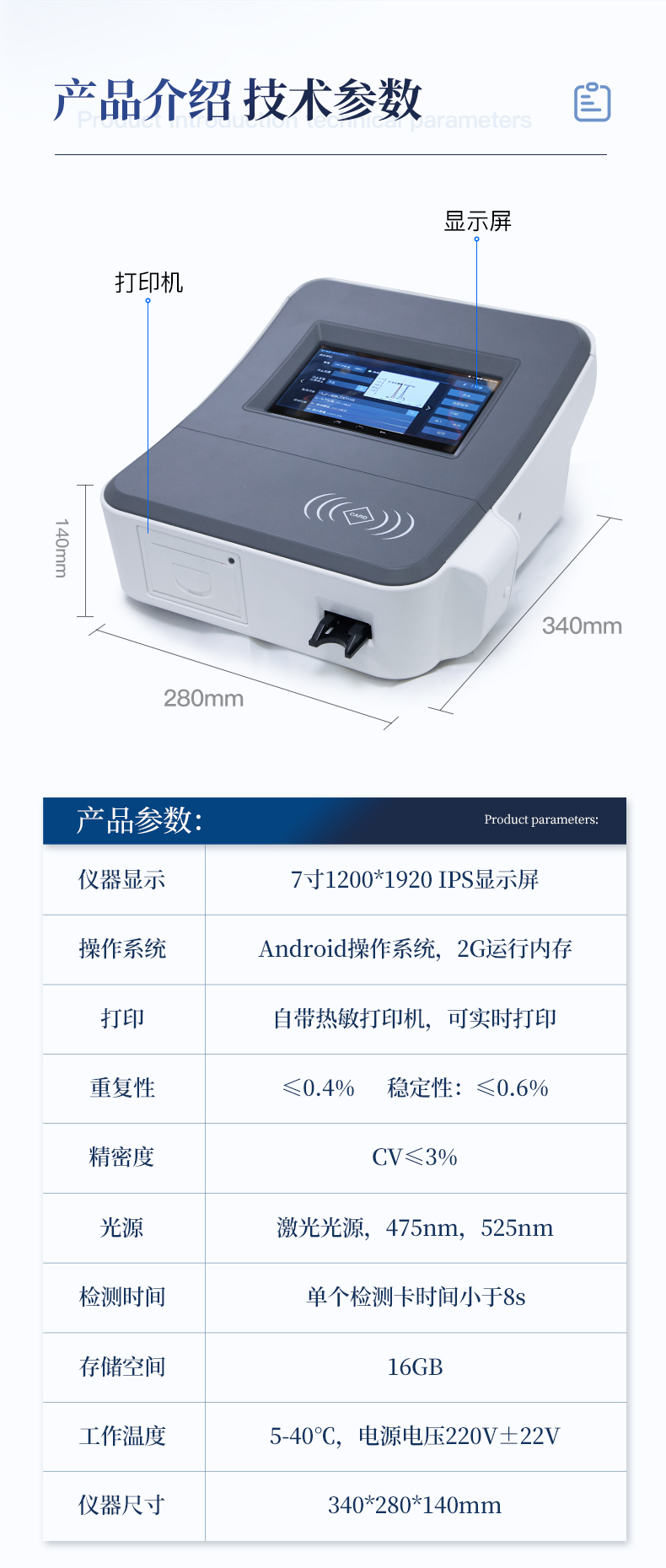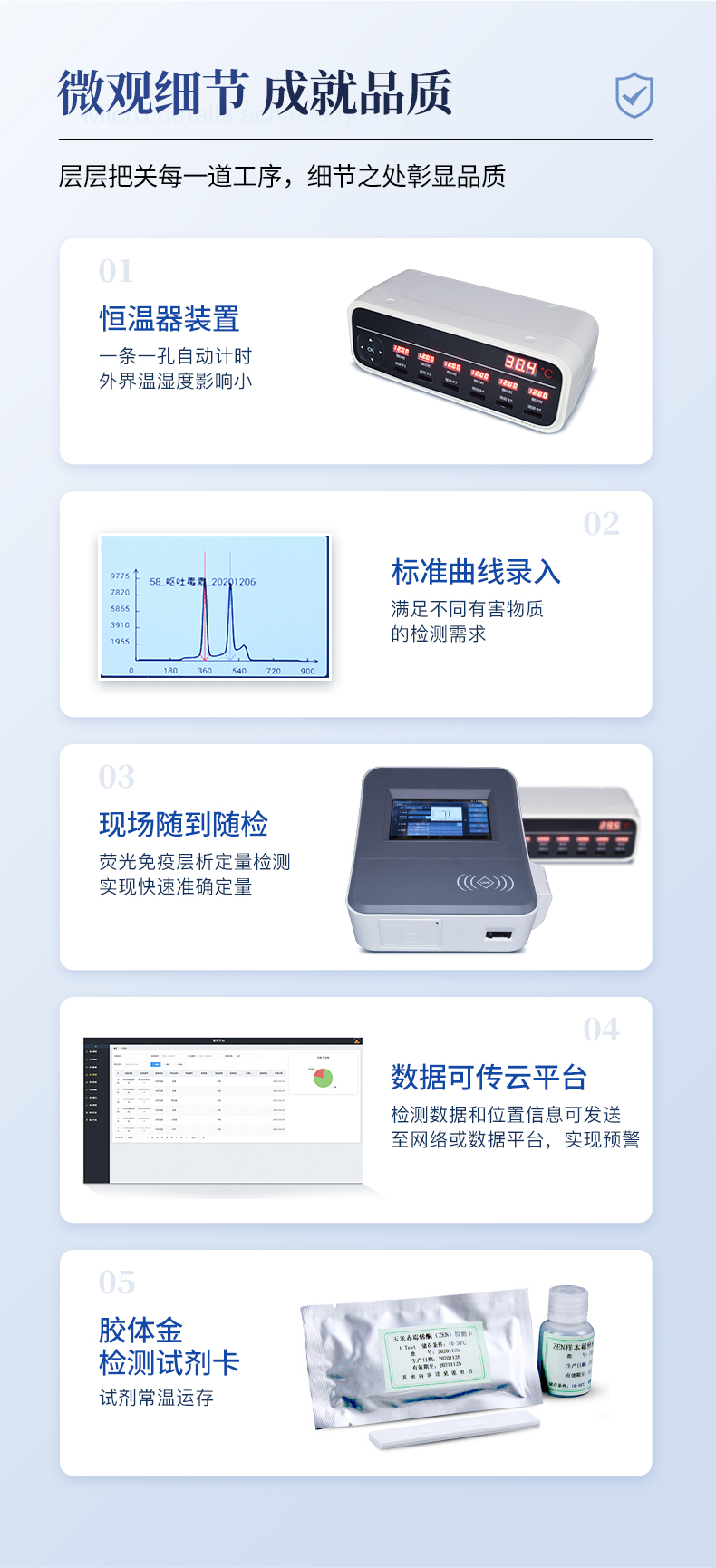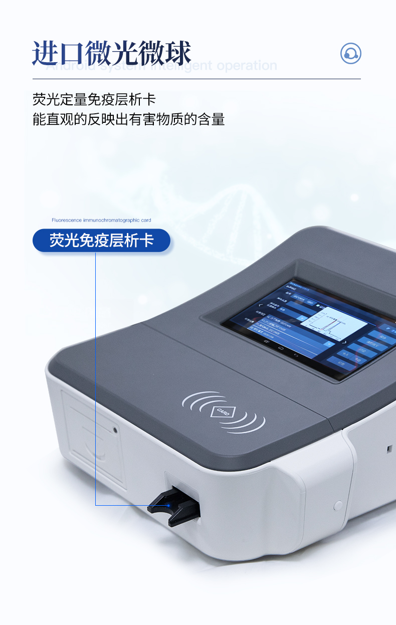 | 1、仪器自动识别检测卡条形码上的检测项目、样本类型、检测限、标准曲线,形成完整的检测数据信息链。一卡一控,插卡后仪器自动读取检测卡显示的C、T线的荧光信号,依据检测卡内置的标准曲线,自动计算结果;用户可根据自身需求,选择设定检测限/定量限(内控或国家标准限量)。 | 2、检测数据信息采集项目(包括但不限于):仪器至少支持以下检测数据采集:①检测项目;②样本类型;③检测样本;④国家限量;⑤检测者;⑥检测单位;⑦检测时间;⑧检测线/定量限;⑨检测编号;⑩内控限量 样本来源等,并支持数据采集项目远程扩展升级。 | 3、检测数据采集方式:检测数据信息采集项目中载明的:①-⑨项为仪器自动识别采集,⑩项为手写输入。 | 4、检测数据上传方式:完成检测后,仪器能自动将检测数据信息采集项目载明的全部检测数据信息上传至检测监管系统平台。 | 5、接口:蓝牙通讯接口;内置无线WIFI,检测数据实时传输到数据监管平台,客户可通过账号登陆在网络上实时查看检测数据 | 6、存储空间:存储空间16GB。 | 7、信息输入:支持中英文手写输入。 | 8、本机数据管理:具有检测数据存储、查询,批量数据删除和打印等功能。 | 9、检测项目管理:仪器支持检测项目及对应国家限量远程增加、删除等维护管理。 | 10、操作权限管理:仪器支持检测操作人员使用账号、密码登陆仪器的功能,支持账号、密码在监管系统平台进行验证。 | 11、在线学习:内置检测项目操作流程简图,教学软件可实时在线更新。 | 12、工作温度:5-40℃,相对湿度:10%-90%。电源电压220V±22V,频率50Hz±1Hz,额定功率40W,与电源的连接方式:可拆卸电源线。 | 13、恒温孵育器 | (1)适用于定量胶体金试纸卡和反应液体准确控温反应,以提高准确性; | (2)孵育器卡槽数6个,每个卡槽时间独立控制; | (3)插入卡条后自动倒计时,倒计时结束自动报警,并记录超时时间; | (4)内部恒温控制,控温温度:37℃,控温精度≤0.5℃,升温速度≤8min,温度均匀性≤0.3℃,实时温度显示精度:0.1℃。 |