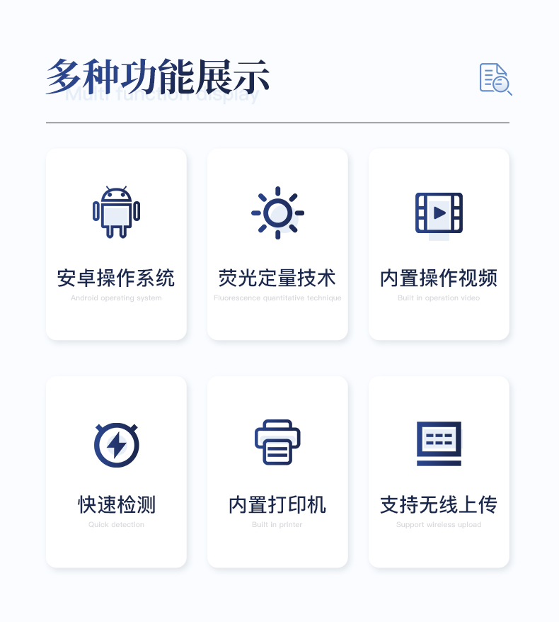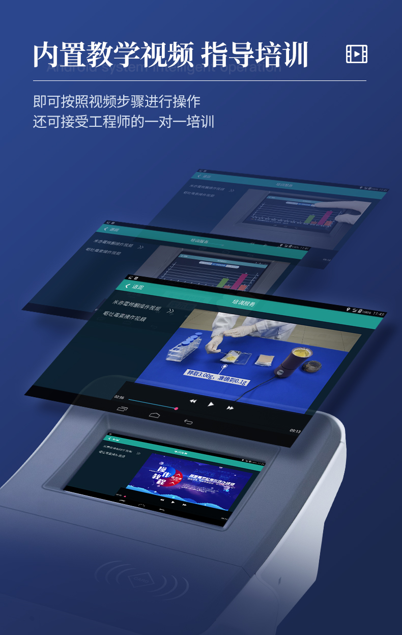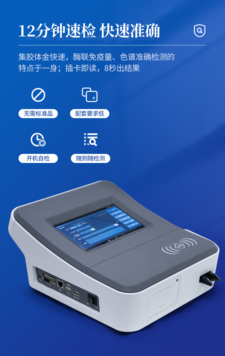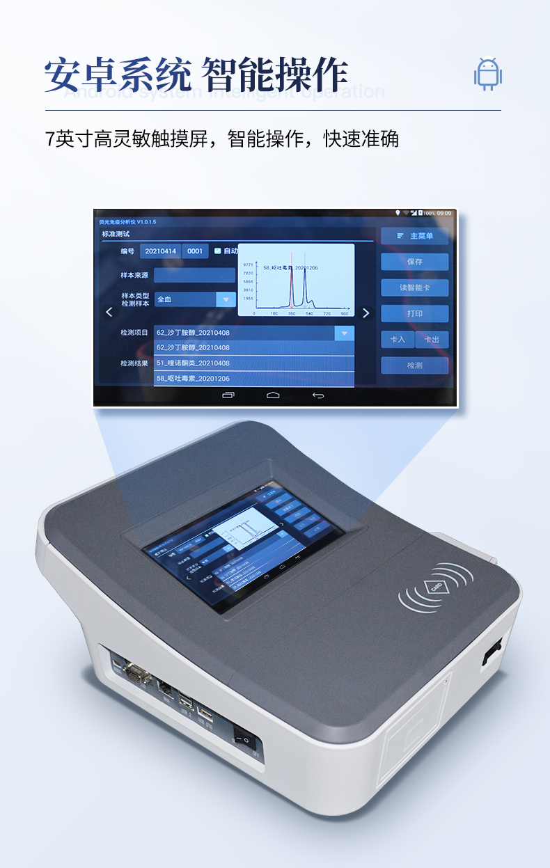 | 1、仪器自动识别检测卡条形码上的检测项目、样本类型、检测限、标准曲线,形成完整的检测数据信息链。一卡一控,插卡后仪器自动读取检测卡显示的C、T线的荧光信号,依据检测卡内置的标准曲线,自动计算结果;用户可根据自身需求,选择设定检测限/定量限(内控或国家标准限量)。 | 2、检测数据信息采集项目(包括但不限于):仪器至少支持以下检测数据采集:①检测项目;②样本类型;③检测样本;④国家限量;⑤检测者;⑥检测单位;⑦检测时间;⑧检测线/定量限;⑨检测编号;⑩内控限量 样本来源等,并支持数据采集项目远程扩展升级。 | 3、检测数据采集方式:检测数据信息采集项目中载明的:①-⑨项为仪器自动识别采集,⑩项为手写输入。 | 4、检测数据上传方式:完成检测后,仪器能自动将检测数据信息采集项目载明的全部检测数据信息上传至检测监管系统平台。 | 5、接口:蓝牙通讯接口;内置无线WIFI,检测数据实时传输到数据监管平台,客户可通过账号登陆在网络上实时查看检测数据 | 6、存储空间:存储空间16GB。 | 7、信息输入:支持中英文手写输入。 | 8、本机数据管理:具有检测数据存储、查询,批量数据删除和打印等功能。 | 9、检测项目管理:仪器支持检测项目及对应国家限量远程增加、删除等维护管理。 | 10、操作权限管理:仪器支持检测操作人员使用账号、密码登陆仪器的功能,支持账号、密码在监管系统平台进行验证。 | 11、在线学习:内置检测项目操作流程简图,教学软件可实时在线更新。 | 12、工作温度:5-40℃,相对湿度:10%-90%。电源电压220V±22V,频率50Hz±1Hz,额定功率40W,与电源的连接方式:可拆卸电源线。 | 13、恒温孵育器 | (1)适用于定量胶体金试纸卡和反应液体准确控温反应,以提高准确性; | (2)孵育器卡槽数6个,每个卡槽时间独立控制; | (3)插入卡条后自动倒计时,倒计时结束自动报警,并记录超时时间; | (4)内部恒温控制,控温温度:37℃,控温精度≤0.5℃,升温速度≤8min,温度均匀性≤0.3℃,实时温度显示精度:0.1℃。 |