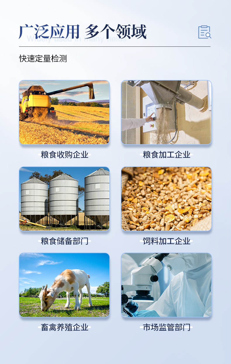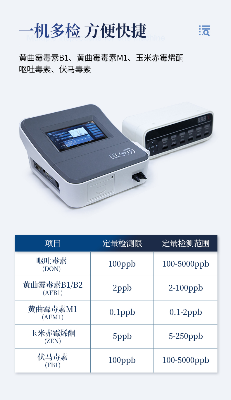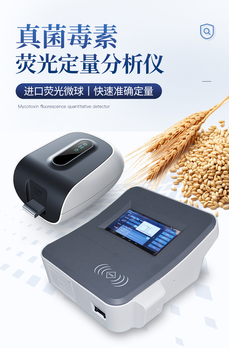 真菌毒素荧光定量分析仪可快速检测粮食、饲料、谷物、食用油、调味品中如玉米、大米、小麦、大麦、糙米、麸皮、稻谷、豆粕、米糠、饲料中的黄曲霉毒素B1、黄曲霉毒素M1、玉米赤霉烯酮、呕吐毒素、伏马毒素,杜绝毒素污染,维护食品安全。