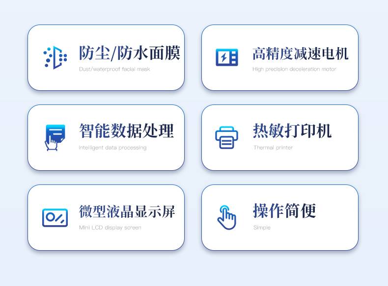 | 防尘、防水面膜、薄膜按键和微型液晶显示屏 | 高精度减速电机及调速器组成的振动部分 | CPU 智能数据处理部分 | 高分辨率热敏打印机 | 测量结果**小数后4 位 | 仪器结构牢固,外型美观,操作简便 |
